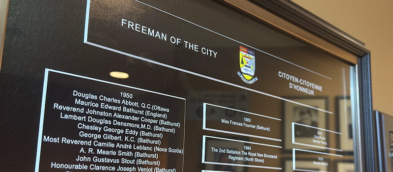 La Ville de Bathurst invite les membres de la communauté à proposer des candidat(e)s pour le titre honorifique de Citoyen (Citoyenne) d’honneur de la ville. Ce titre représente la plus haute distinction décernée par la Ville en reconnaissance d’un service de longue date et d’un leadership extraordinaire. C’est un titre honorifique réservé aux individus qui ont contribué de façon significative à la vie de la communauté.